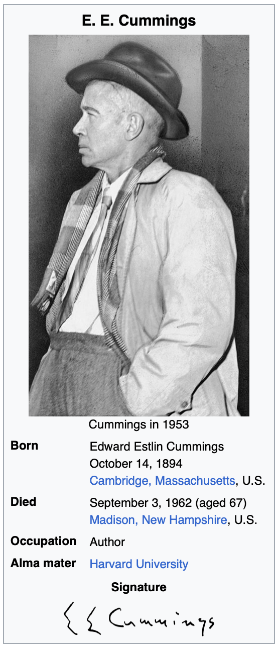 Cummings (October 14, 1894 – September 3, 1962), was an American poet, painter, essayist, author, and playwright.